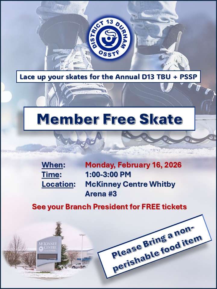 Lace up for our annual Family Day Free Skate at the McKinney Centre Arena #3 from 1-3 pm.  Free hot chocolate!  Please bring a non-perishable food item for our local food bank.  Get tickets from your school's branch president, and see poster below for more details.  See you there!