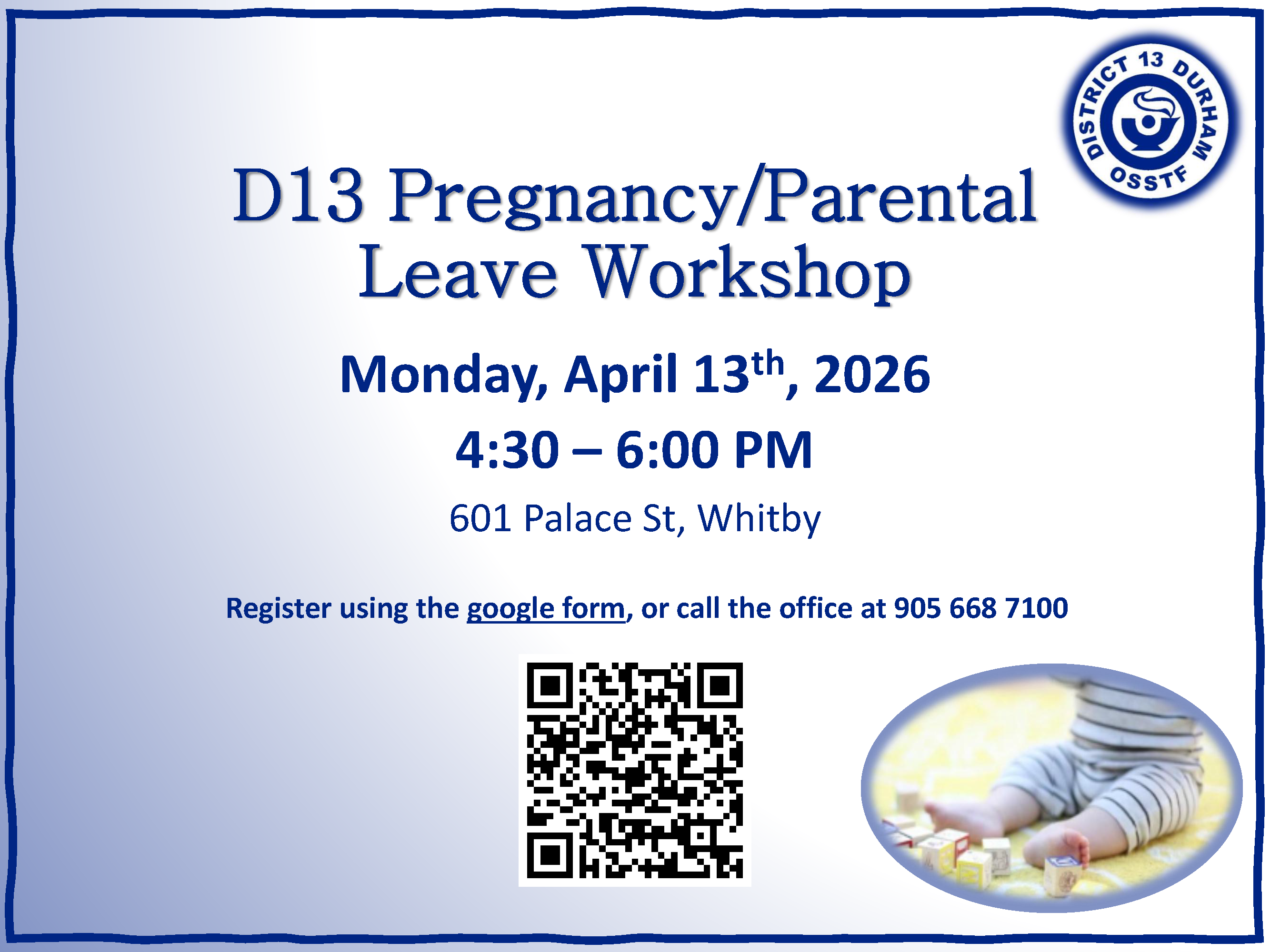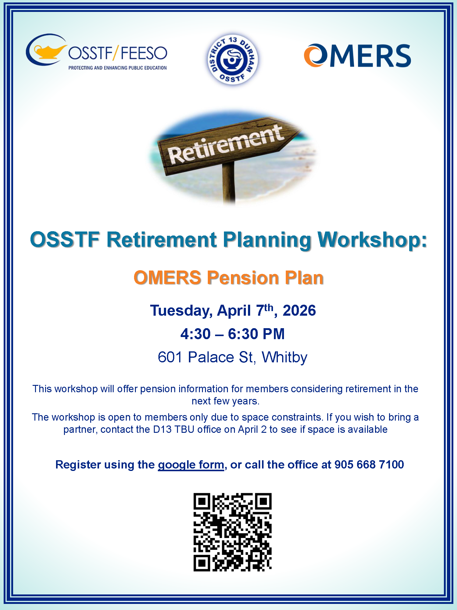 The OSSTF Provincial Office will be offering a Retirement and Pension workshop on Monday, April 20, 2026 from 4:30-6:30 PM at the D13 TBU office. Space is limited and registration is required. See the poster for details and register using the QR code on the poster, or this link.