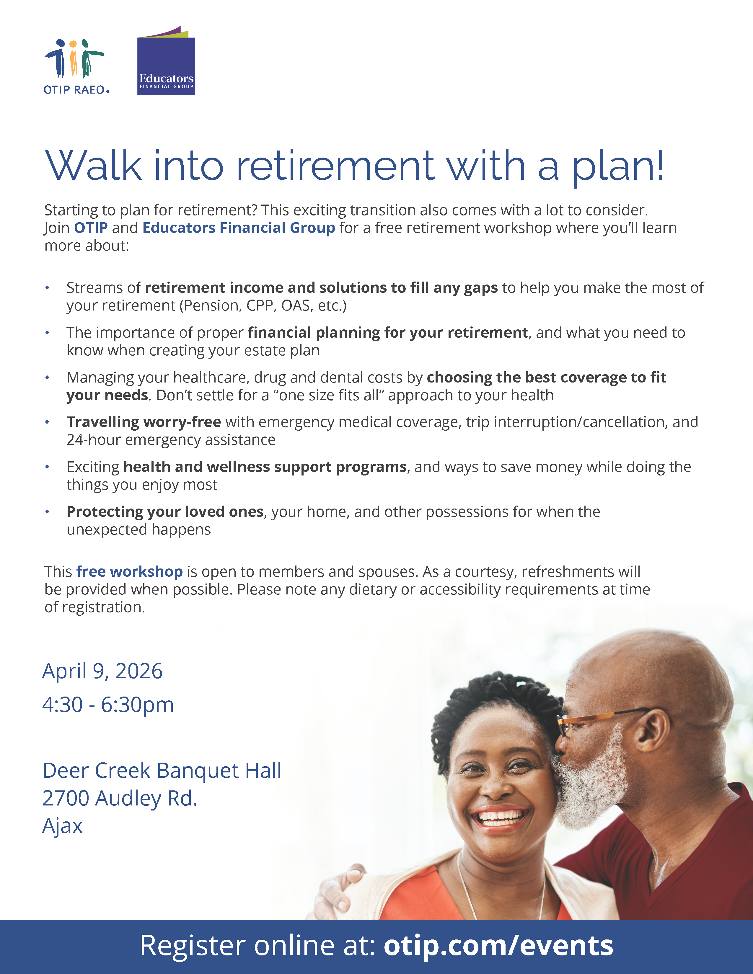 Ontario Teacher Insurance Plan and Educators Financial Group are hosting retirement workshops at various locations across the GTA, as well as virtually. The next workshop is being held at the Deer Creek Banquet Hall in Ajax, on April 9, 2026. Registration details and information on virtual workshops can be found on their website, at the following link: https://www.otip.com/events.
